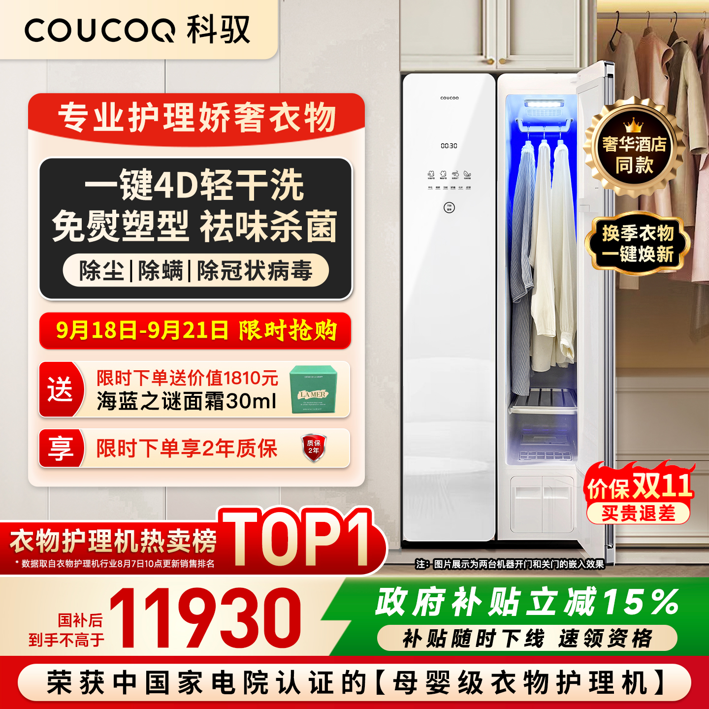 16990【母婴认证】COUCOQ科驭A1家用衣物护理机热泵蒸汽烘干消毒干洗机