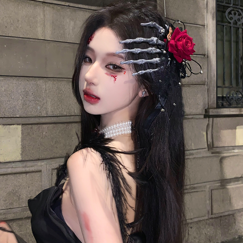 19.9洛丽塔头饰cos暗黑哥特酒红玫瑰骷髅手指发夹万圣节发饰道具装扮