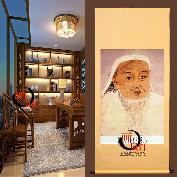 168成吉思汗画像蒙古挂画复古怀旧刺绣中堂铁木真卷轴布艺客厅装饰画