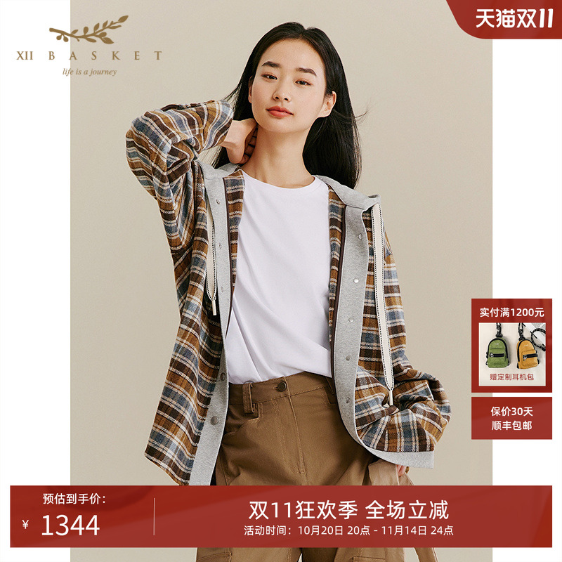 1634XII BASKET十二篮25秋新款户外休闲复古美拉德格纹羊毛连帽衬衫女