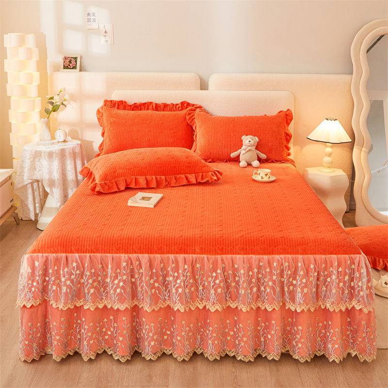 460.65新款结婚庆大红色宝宝绒床裙三件套韩式保暖夹棉蕾丝床罩加厚床单