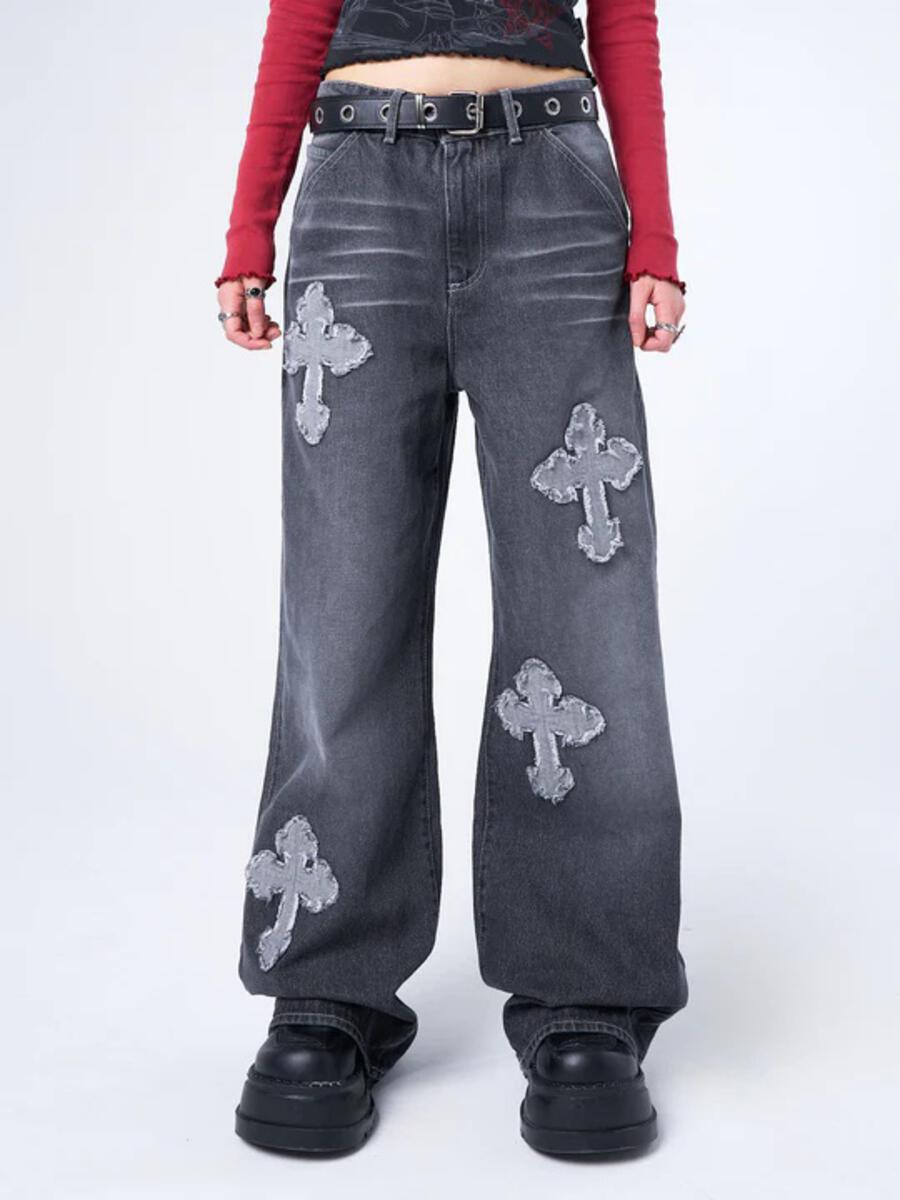 760Minga新品 美式Y2K水洗灰黑色十字架贴布自然腰宽松直筒牛仔长裤