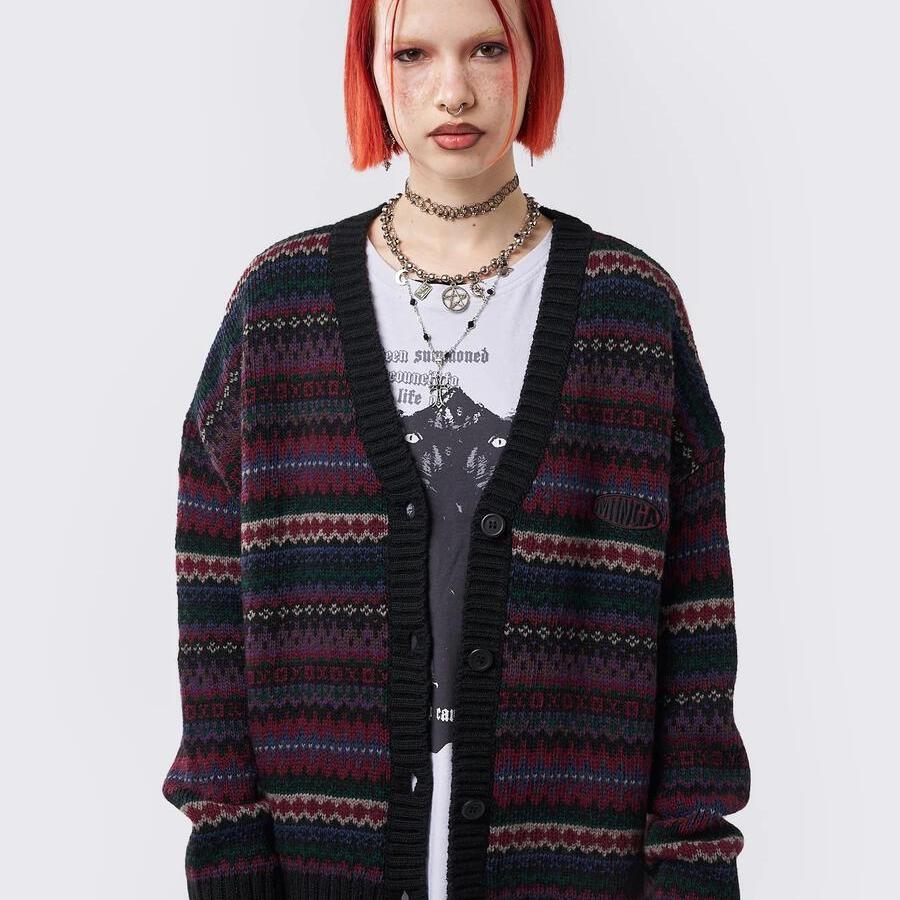 720Minga 冬季 复古几何图案 条纹拼色 落肩慵懒毛衣针织开衫外套