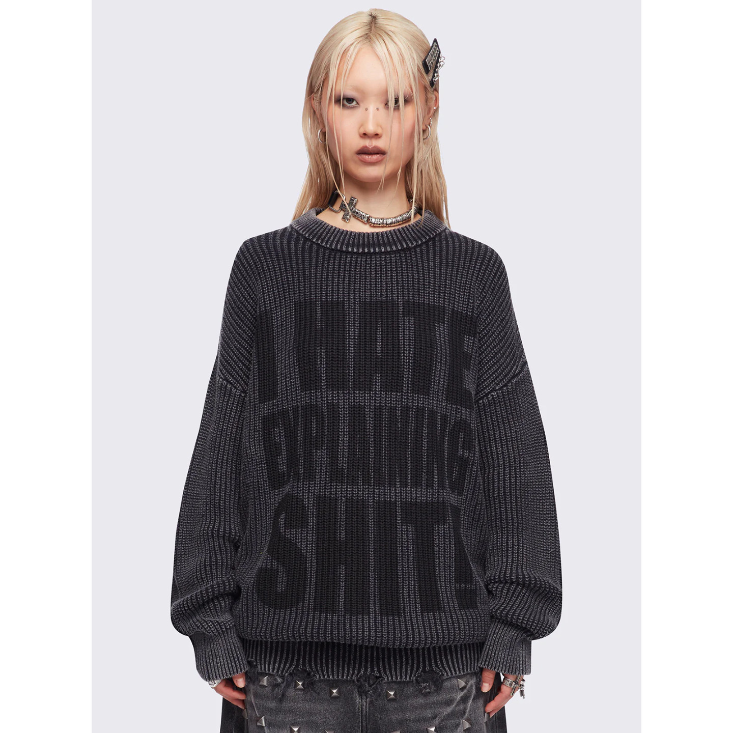 820Minga新品 亚文化水洗黑色字母图案 宽松圆领罗纹针织毛衣上衣