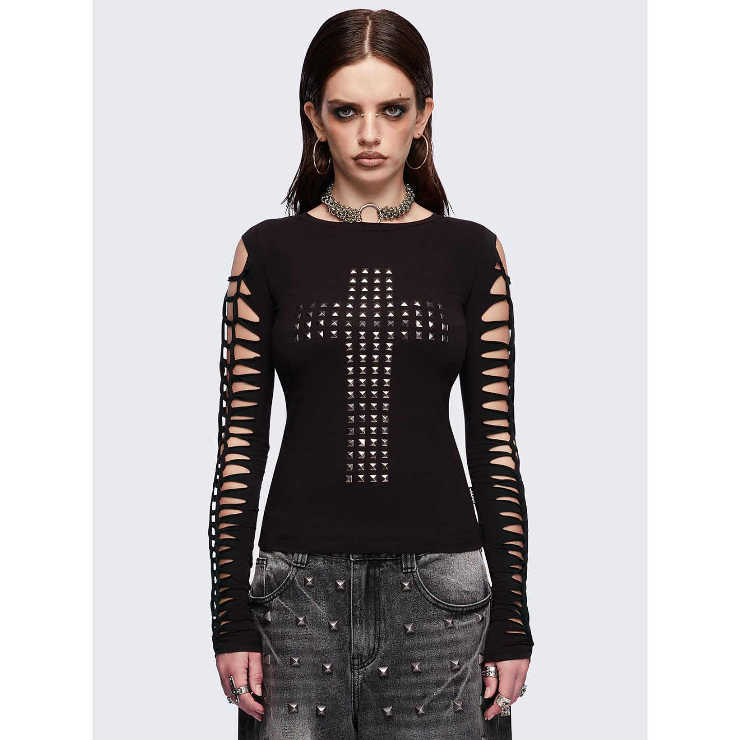 480Minag 亚文化朋克 铆钉十字架/ 镂空开衩袖设计 短款修身长袖上衣