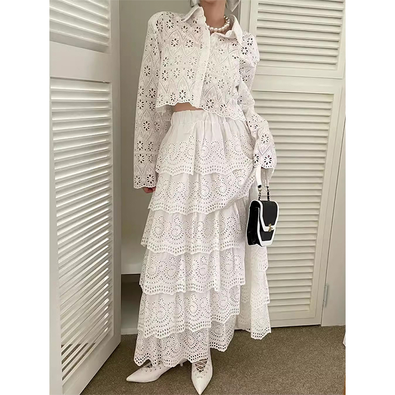 82韩国chic春季新款复古重工镂空钩花蕾丝衬衫+高腰蛋糕半身裙套装