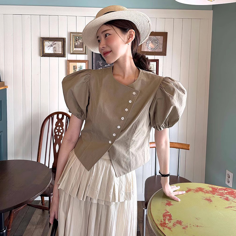 62.8韩国chic法式度假风一字领露肩木耳边拼接设计感小众灯笼袖衬衫女