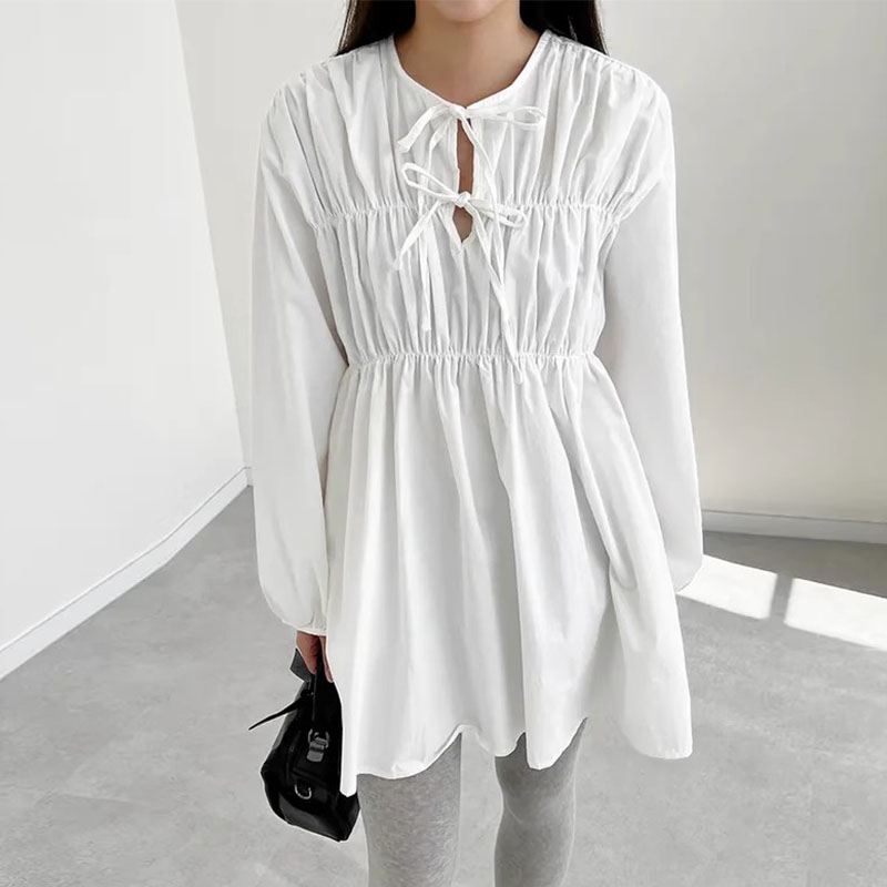59.8韩国chic春季法式简约系带V领领褶皱设计宽松长袖小个子连衣裙女