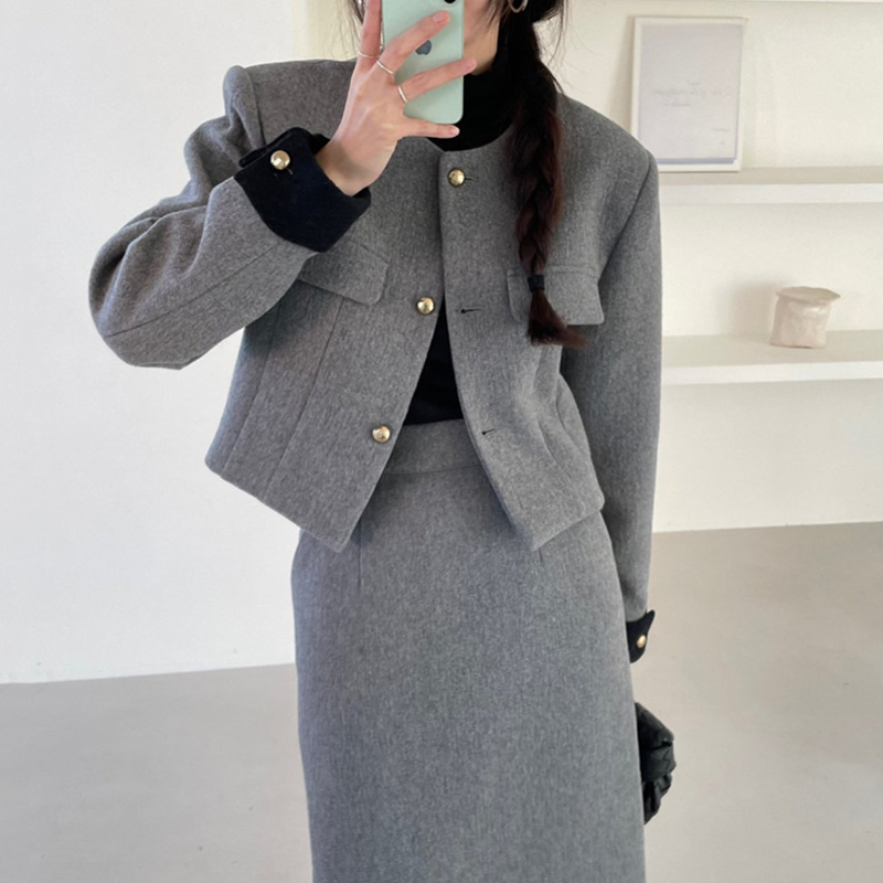 75韩国chic复古简约圆领撞色长袖毛呢外套+高腰后开叉半身裙套装女