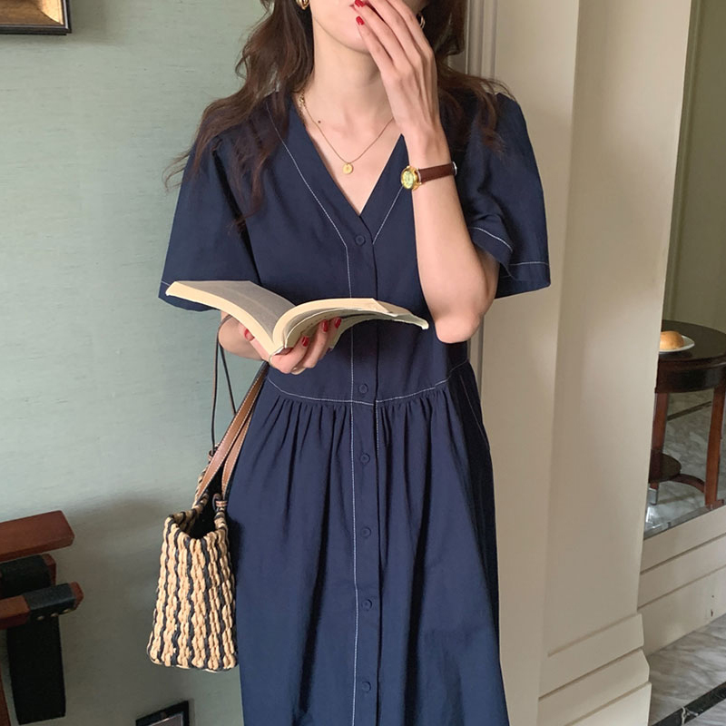 65.6韩国chic夏季法式优雅V领单排扣明线设计宽松中长裙短袖连衣裙女