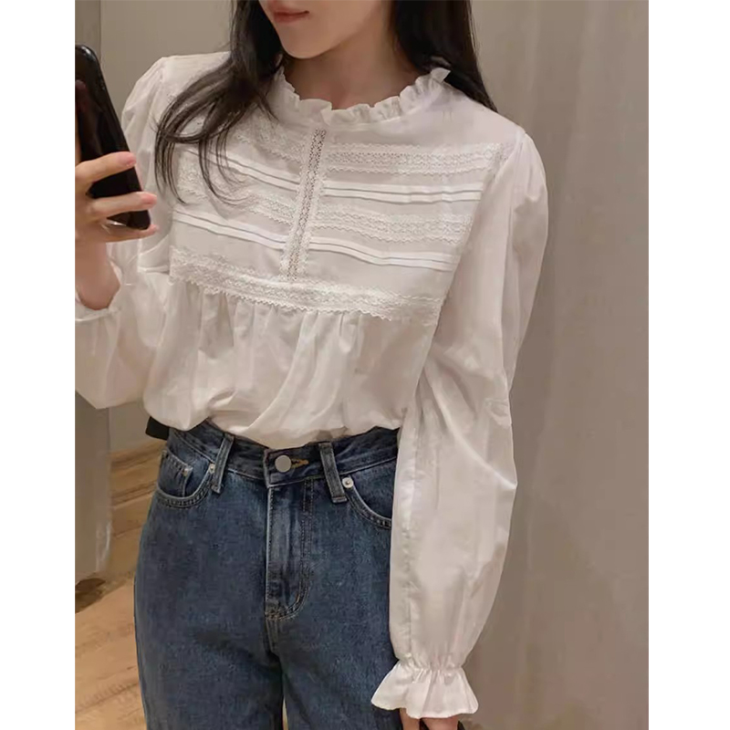 65.8韩国东大门春季温柔减龄立领拼接蕾丝花边宽松百搭纯色长袖衬衫女