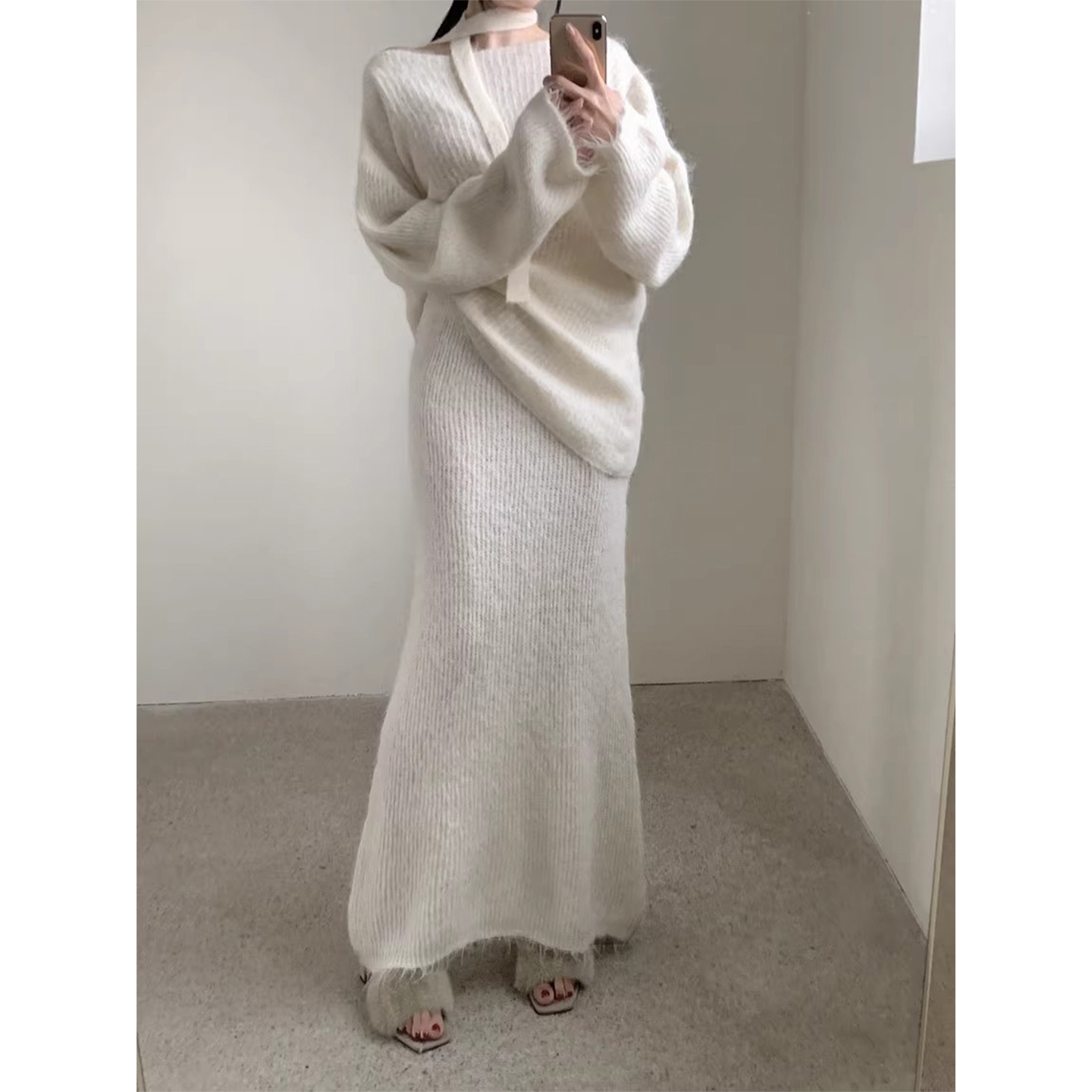 109.98针织套装慵懒软糯露肩毛衣女冬季新款高腰显瘦鱼尾半身裙两件套