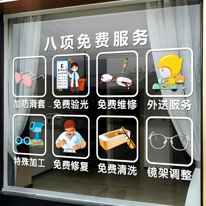 38创意眼镜店免费服务专案标识橱窗玻璃贴纸验光配镜店装饰自黏贴画