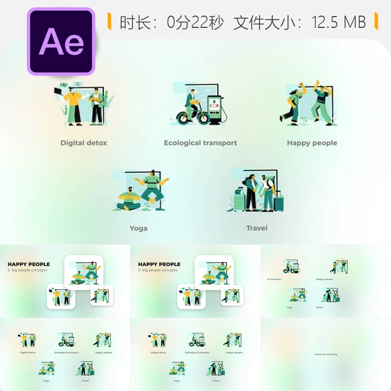 快乐人物生态旅行瑜伽运动健康生活数字排毒冥想放松AE模板设计