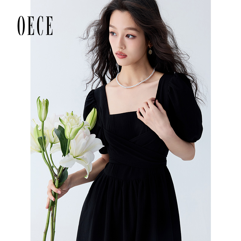 349Oece设计感赫本风泡泡袖连衣裙夏新款女复古收腰显瘦气质方领长裙