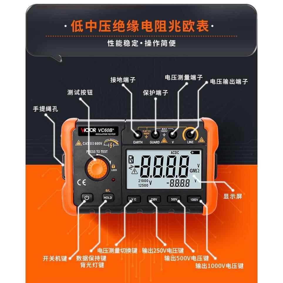 870.8极速。胜利绝缘电阻测试仪VC60B+ 1000V数字兆S欧表电工摇表绝缘