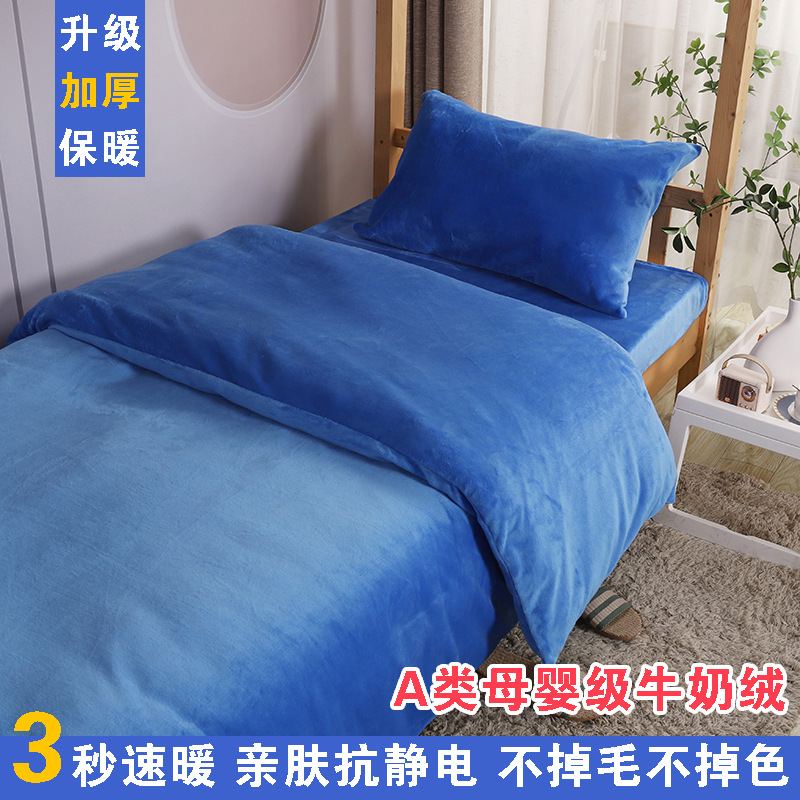 蓝色加厚牛奶绒学生宿舍三件套冬季双面法莱绒被罩床单0.9m上下铺