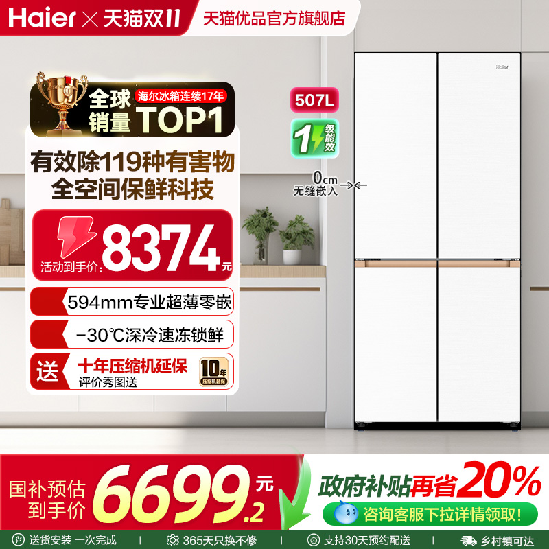 9099海尔电冰箱以旧换新补贴超薄零嵌入式十字四门507L大容量家用麦浪