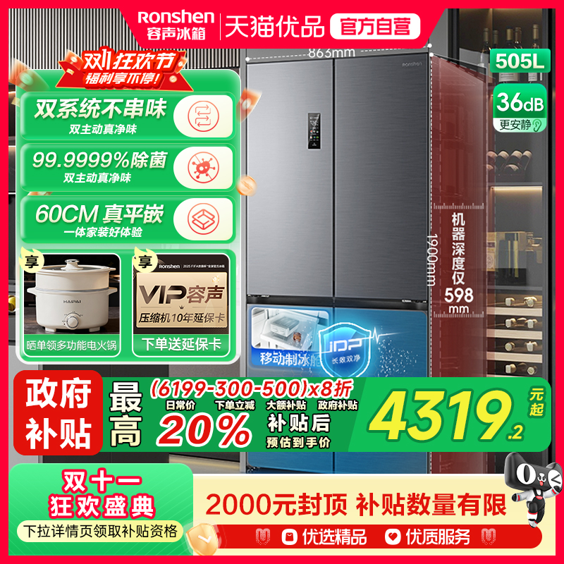 8999容声方糖505L主动双净双系统十字家用四开门超薄嵌入电冰箱制冰R