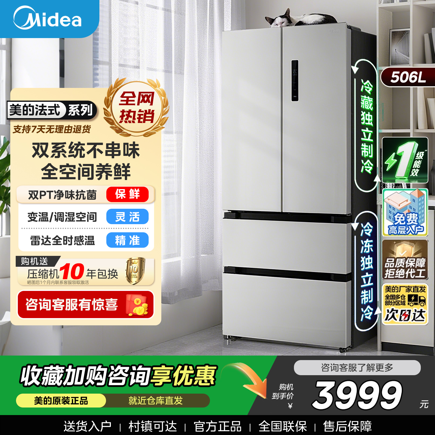 7299政府补贴20%美的508真香法式多门四门双系统风冷无霜一级家用冰箱