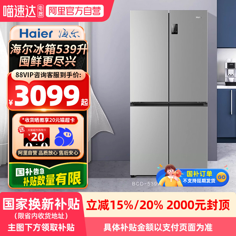 5058补贴20%海尔冰箱539L十字对开门四门家用大容量变频超薄风冷无霜