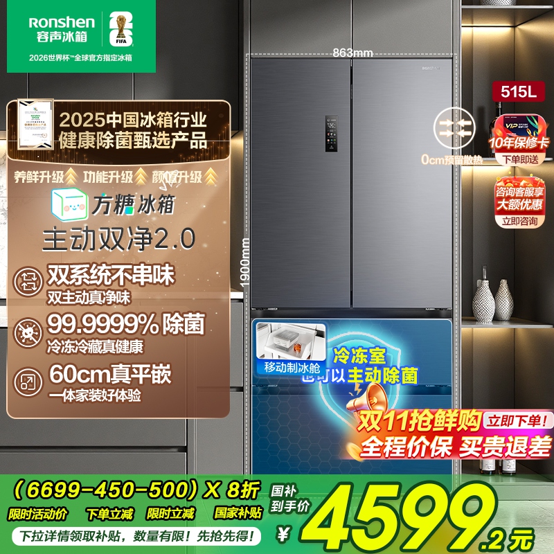 10999容声515L方糖主动双净双系统自动制冰法式四开门家用嵌入式电冰箱