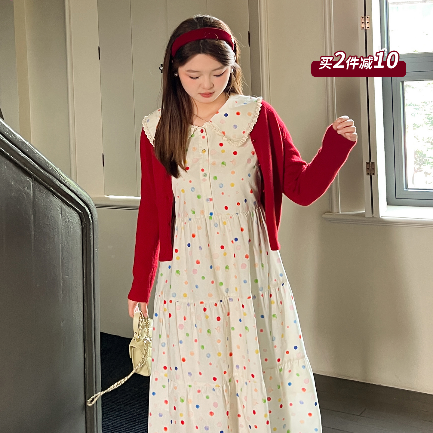 126.2DM100大码百分百女装秋季微胖mm甜美娃娃领波点长裙搭针织衫套装