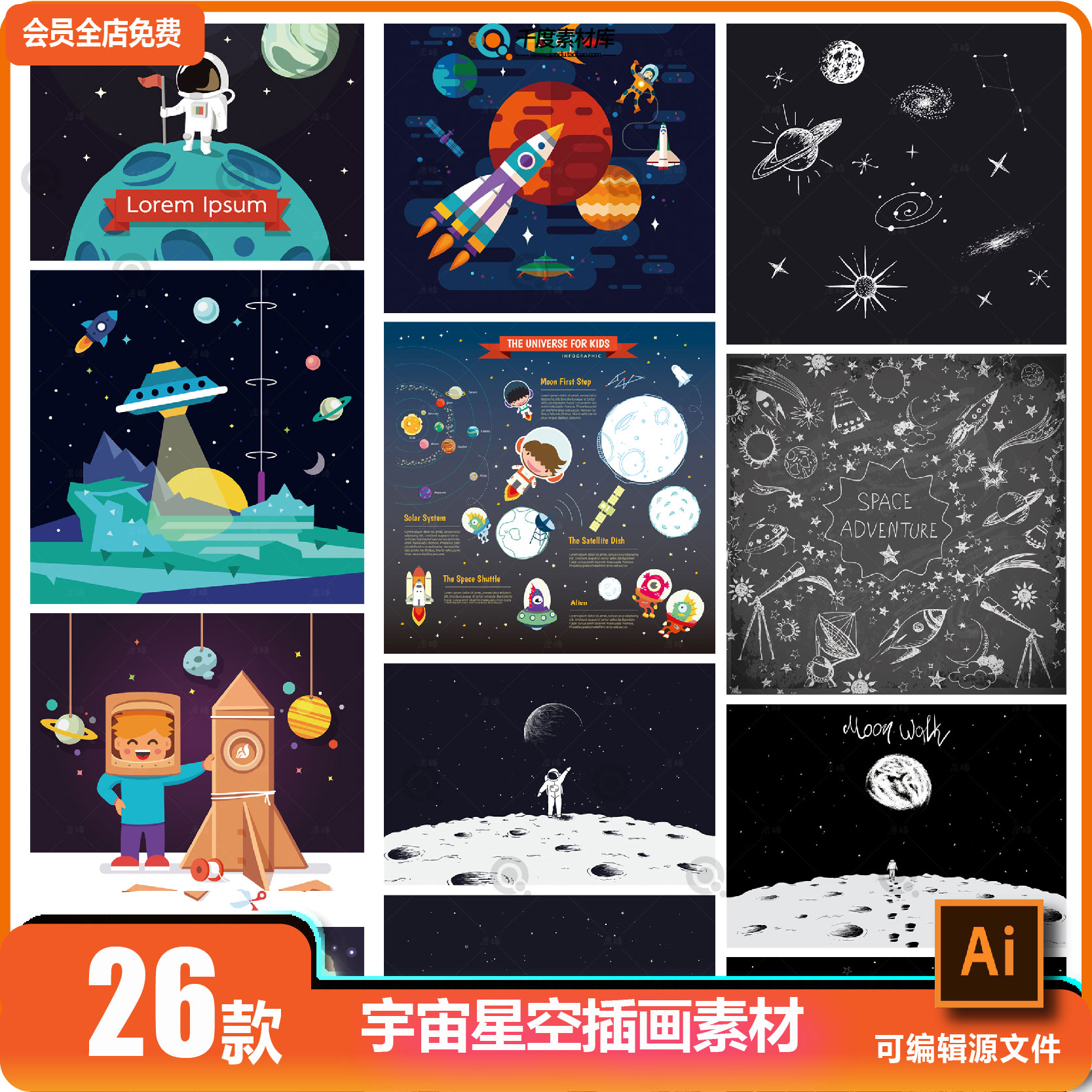 4.6太空宇宙卡通宇航员星空月球电脑贴纸AI背景图案插画矢量素材模板