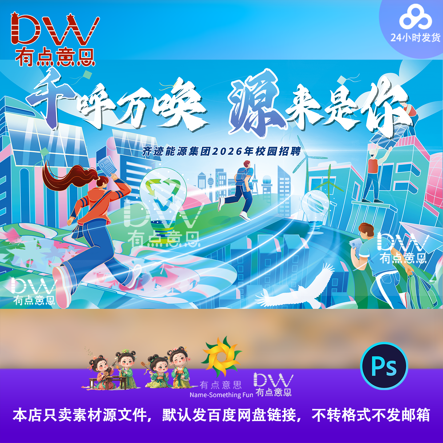 3.99青春活力能源集团企业校园招聘主视觉kv展板背景设计素材手绘插画