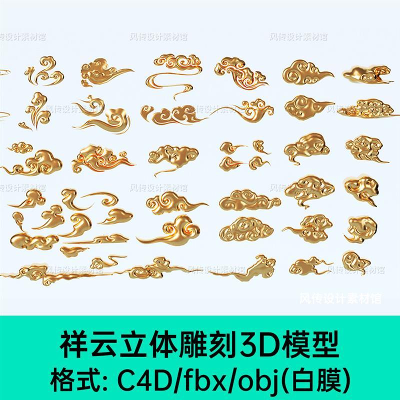 祥云立体3D雕刻模型新年节日国潮图案纹理C4D建模云朵obj fbx素材