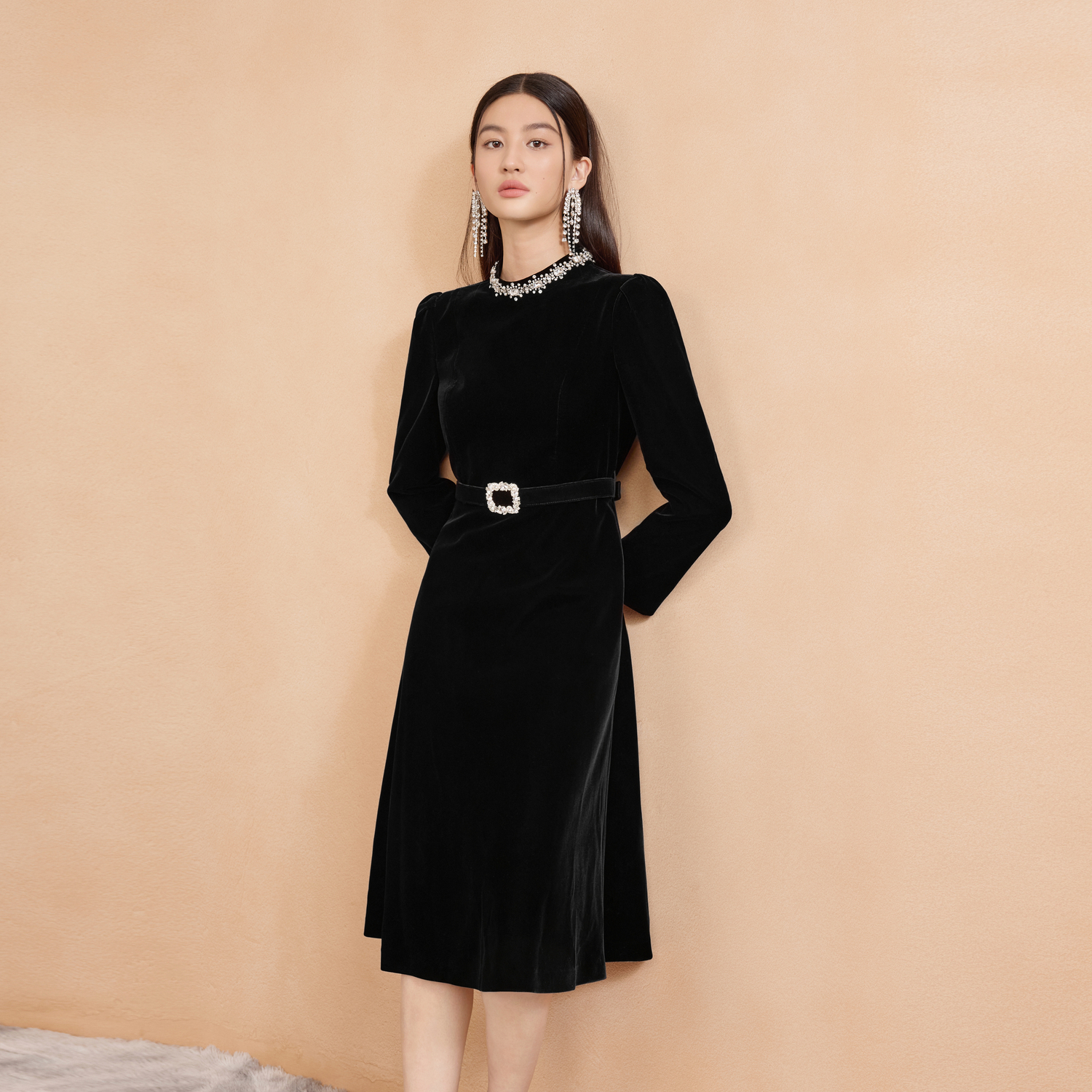 朗姿集团LIME莱茵高级感轻奢商务丝绒连衣裙黑色25秋新款收腰裙