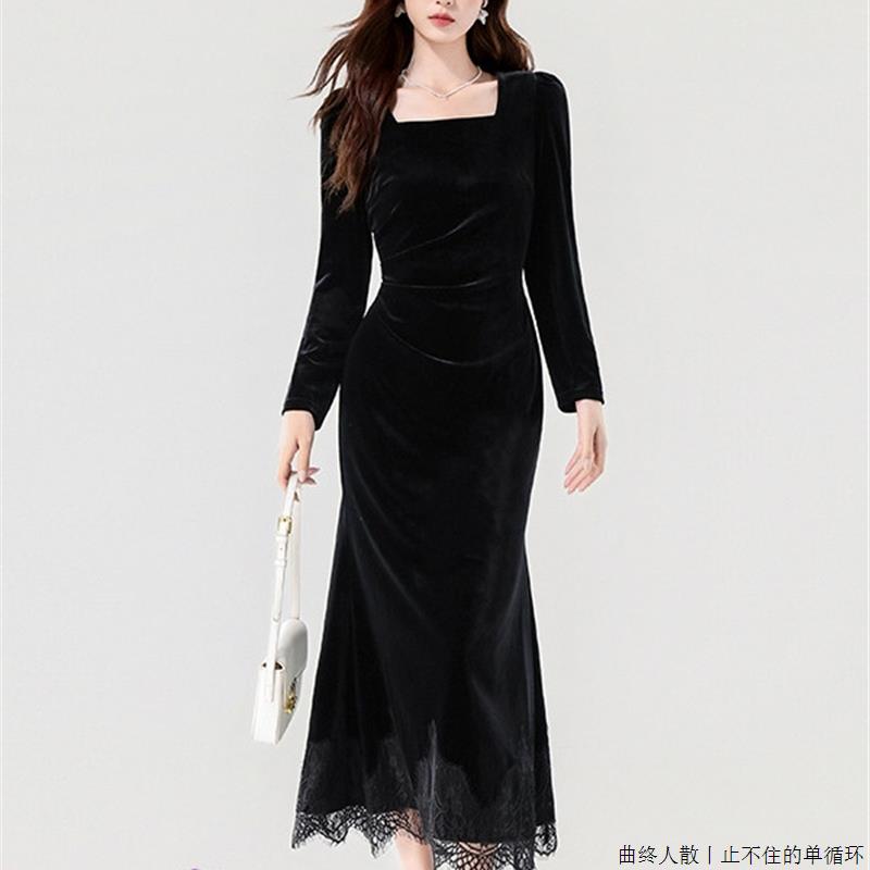 100.7高级法式时尚覆古气质减龄长袖方领丝绒连衣裙黑色晚礼服鱼尾长裙