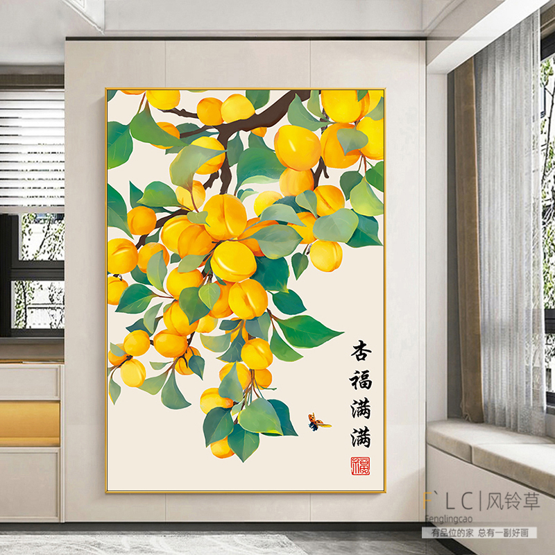 12.8杏福满满卷轴挂画新中式玄关装饰画走廊过道挂画入户挂布墙画定制