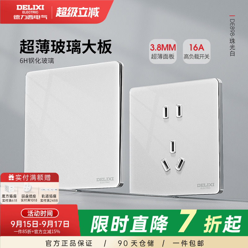 34.95德力西超薄玻璃开关插座钢化面板一开五孔16A墙壁家用898白旗舰店
