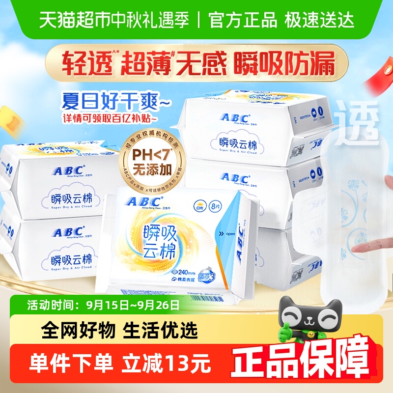 39.9【下拉领补贴】包邮ABC卫生巾姨妈巾瞬吸云棉柔日用组合官方正品
