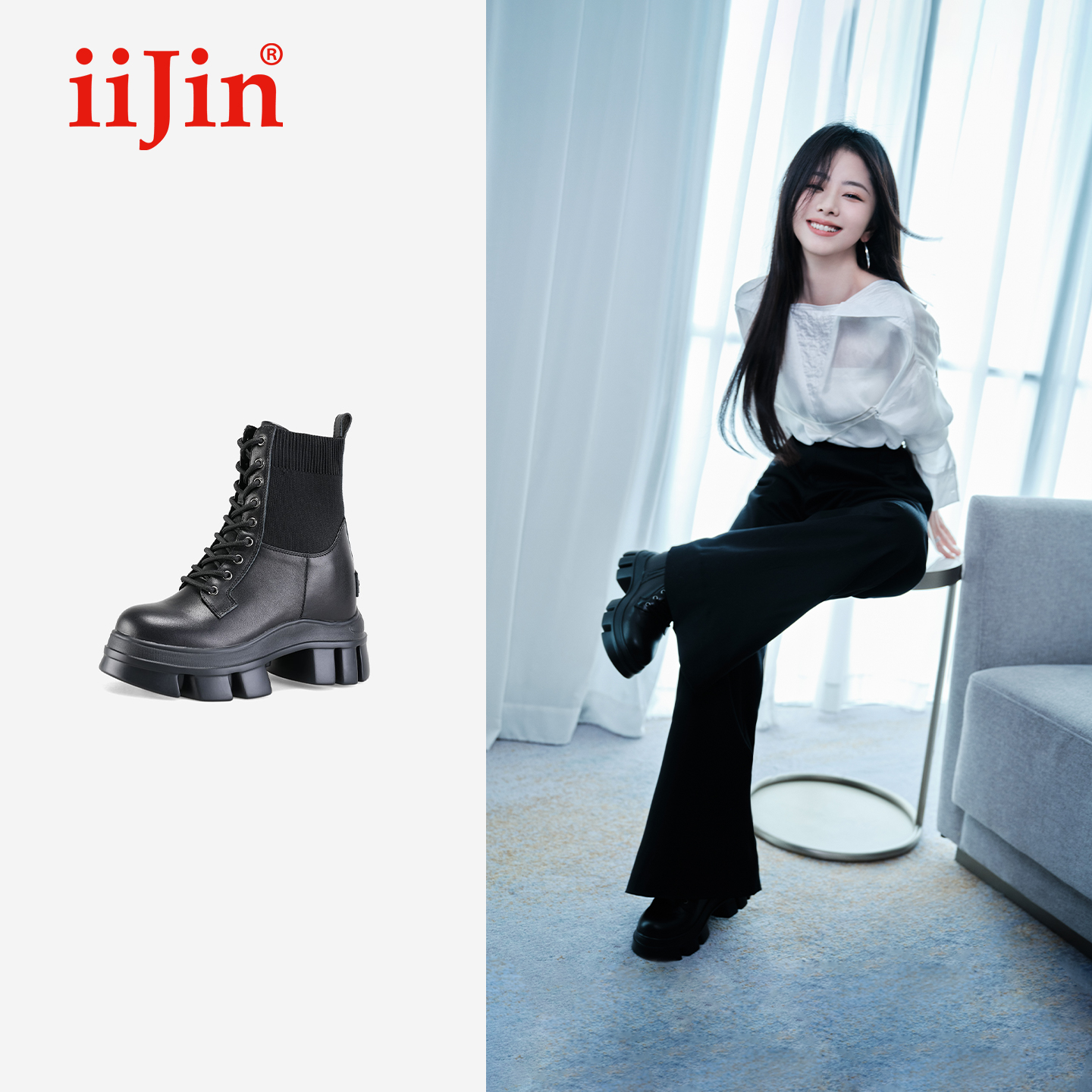 2210【谭松韵同款】iiJin艾今10.5cm厚底内增高针织马丁短靴女958EXS