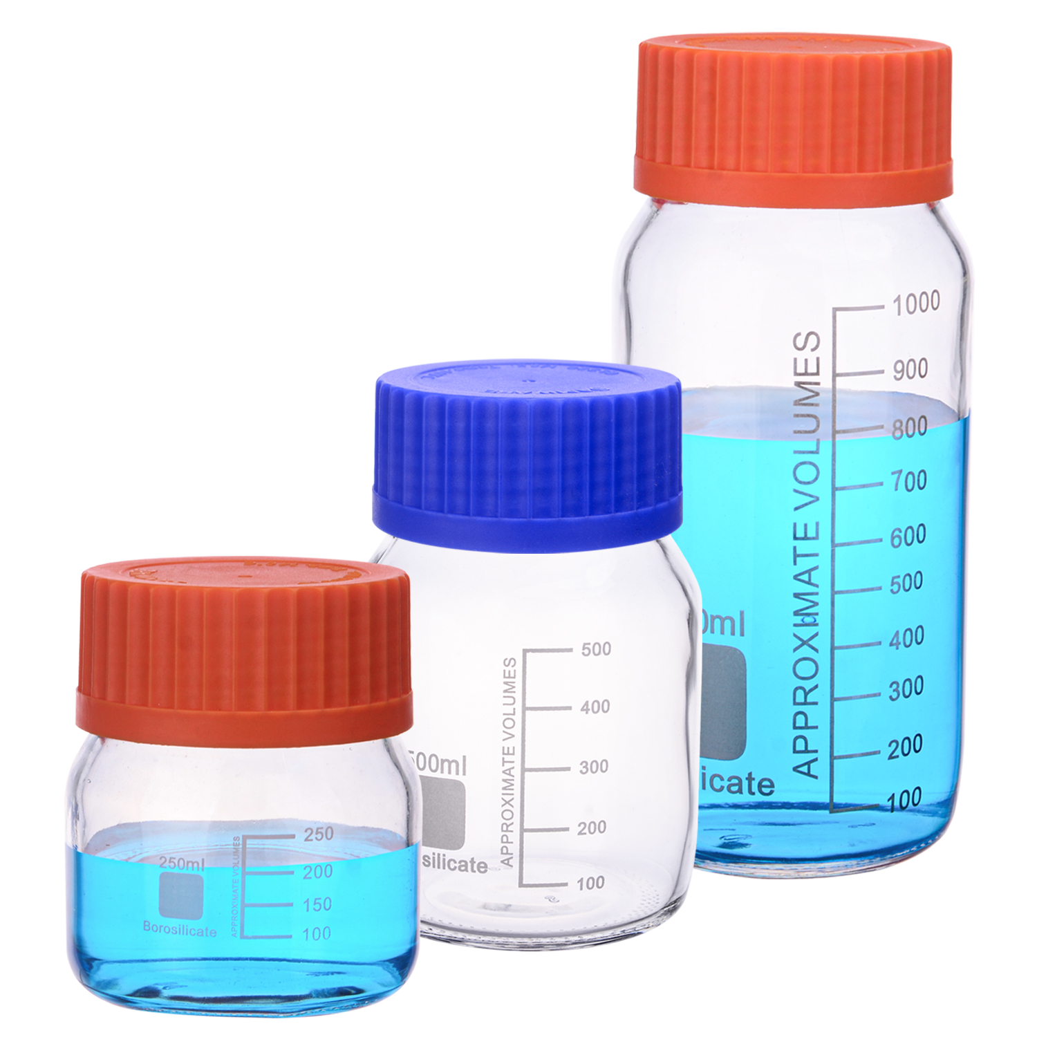 蓝盖试剂瓶透明玻璃棕色丝口瓶GL45GL80广口螺口刻度100ml 250ml 500ml 1000ml 2000ml多色盖子可选