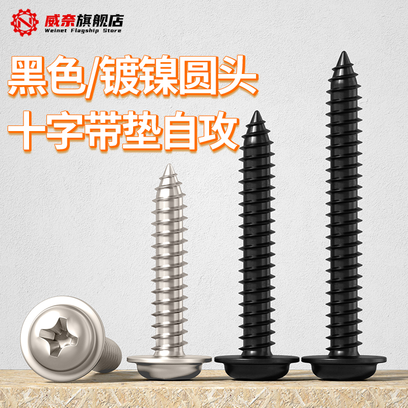 5PWA铁镀镍圆头十字带垫自攻螺丝黑锌碳钢尖尾螺钉M2M2.3M2.6M3M4