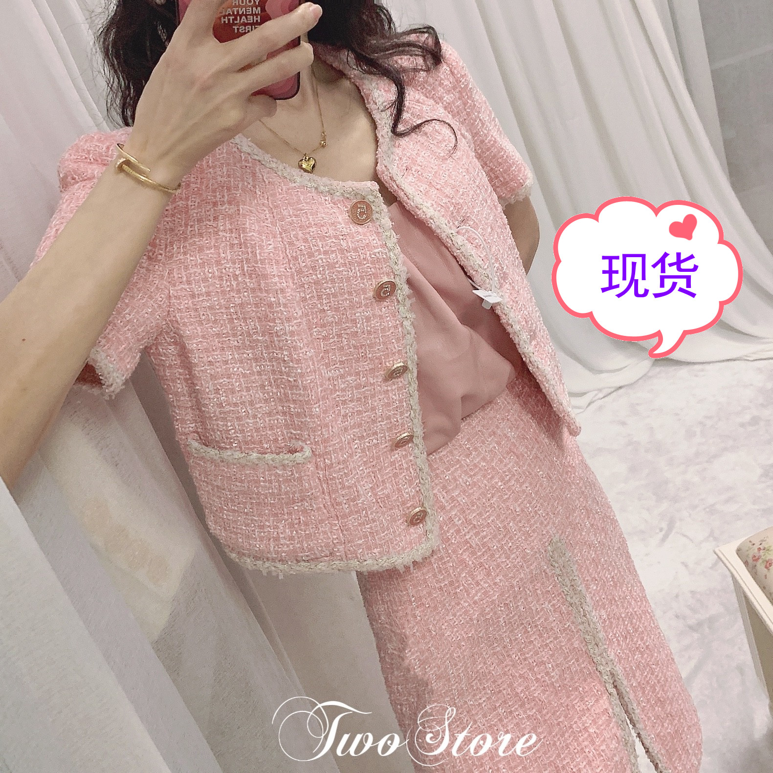 136TWO2022夏新款蜜桃粉色小香风套装女短袖马甲外套开叉半裙两件套
