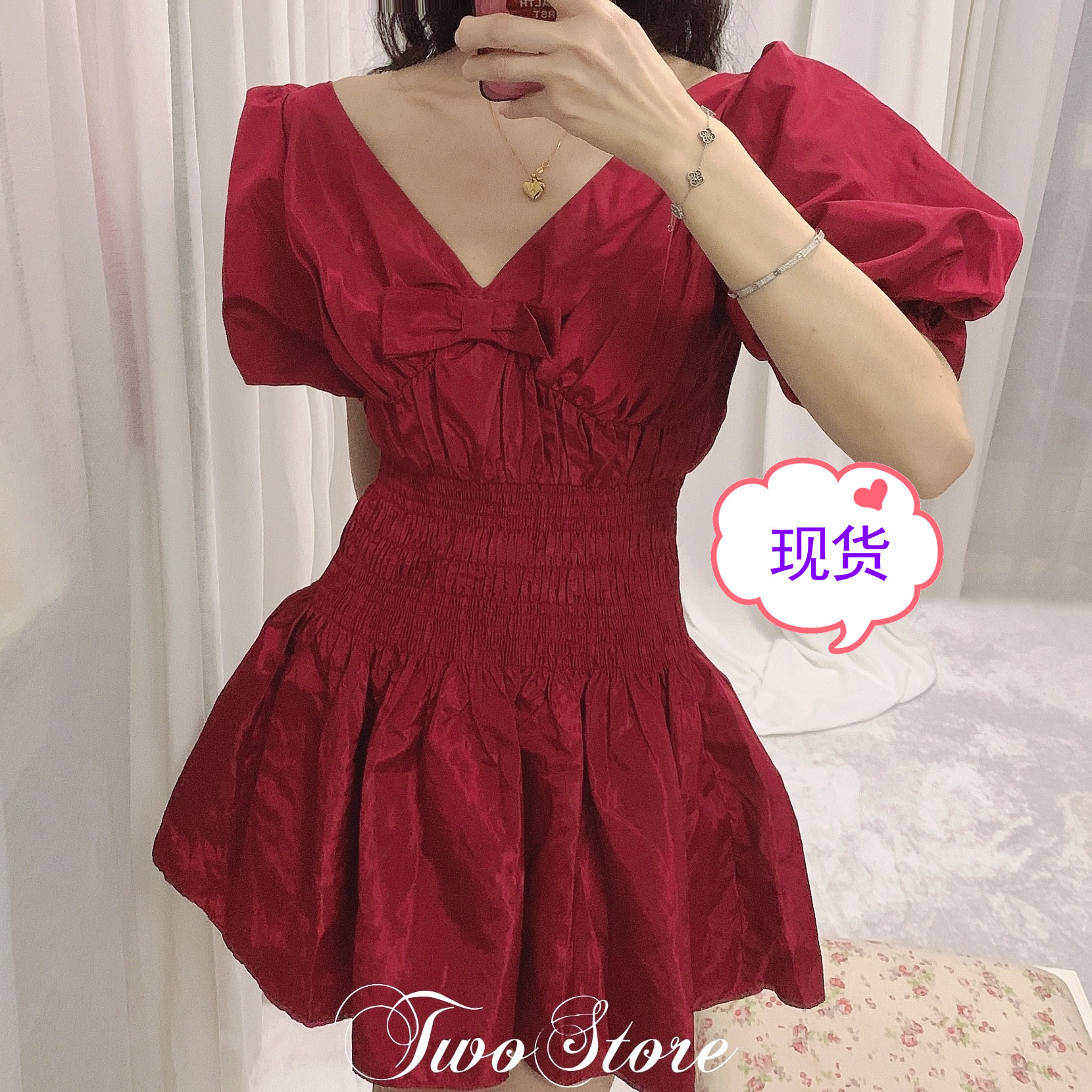 176TWO2022夏新款气质V领露背短袖泡泡袖收腰红色连衣裙短裙小礼服女