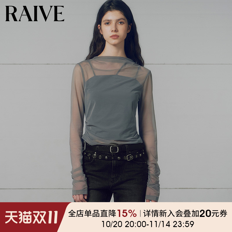 559RAIVE2025秋季新款吊带外搭两件套纯色韩版长袖T恤薄雾少女网纱衣