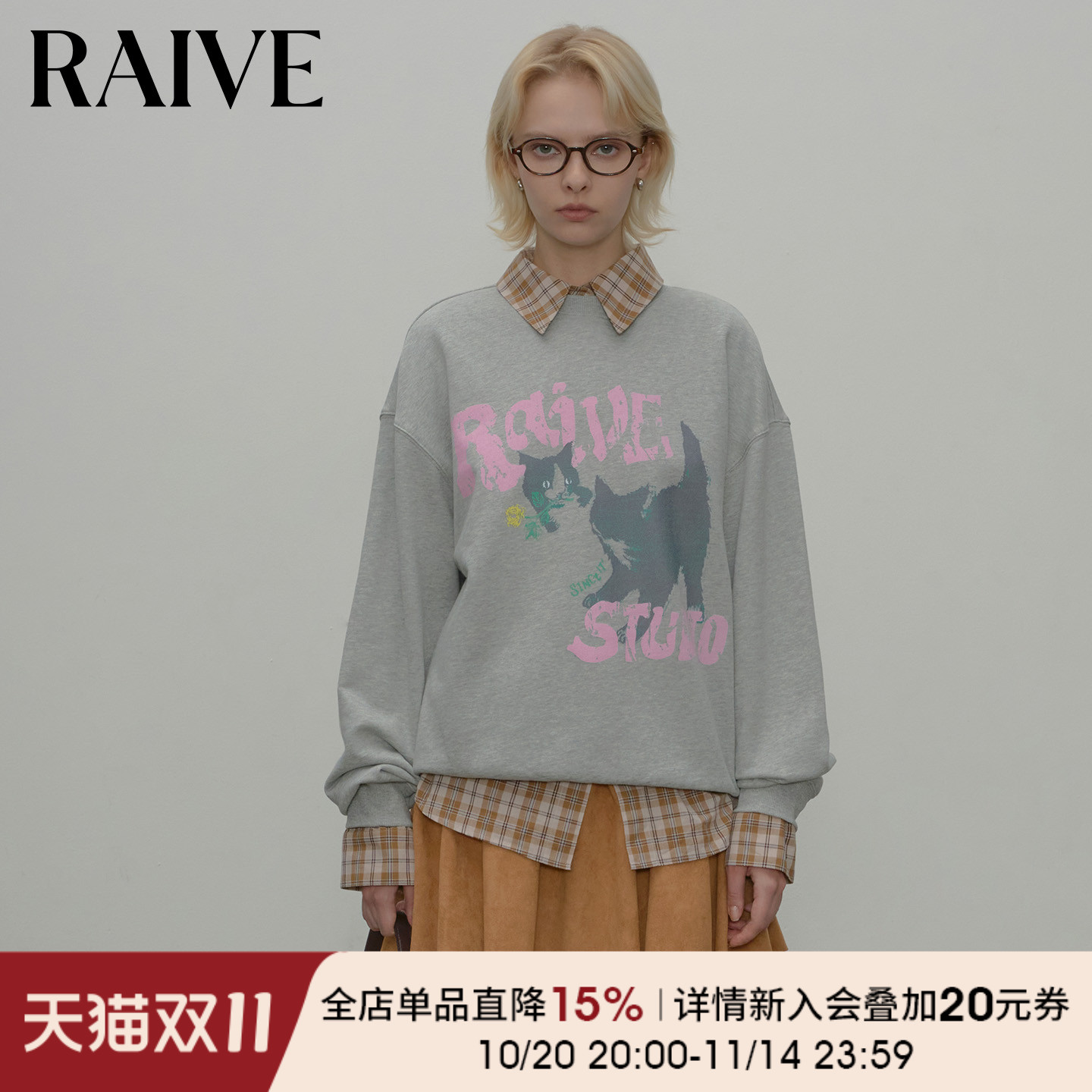 699RAIVE小猫卫衣2025秋冬新款女宽松复古撞色logo印花全棉套头上衣
