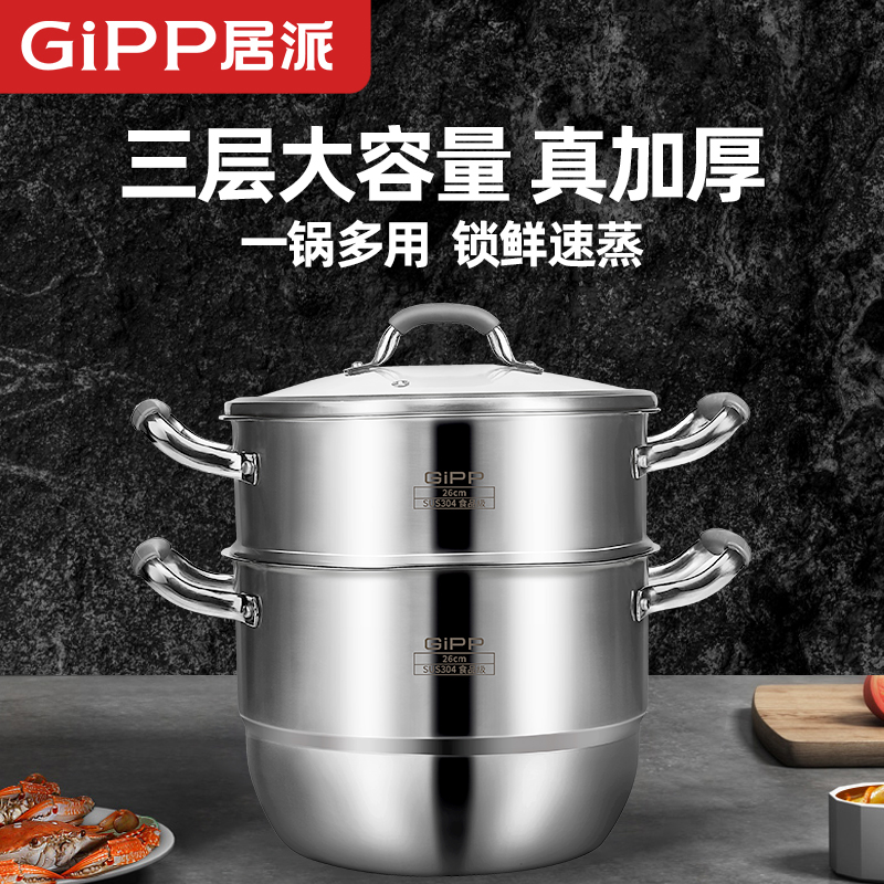 299居派GiPP优质304不锈钢新款蒸锅加厚家用锅具蒸馒头 一体三层复合