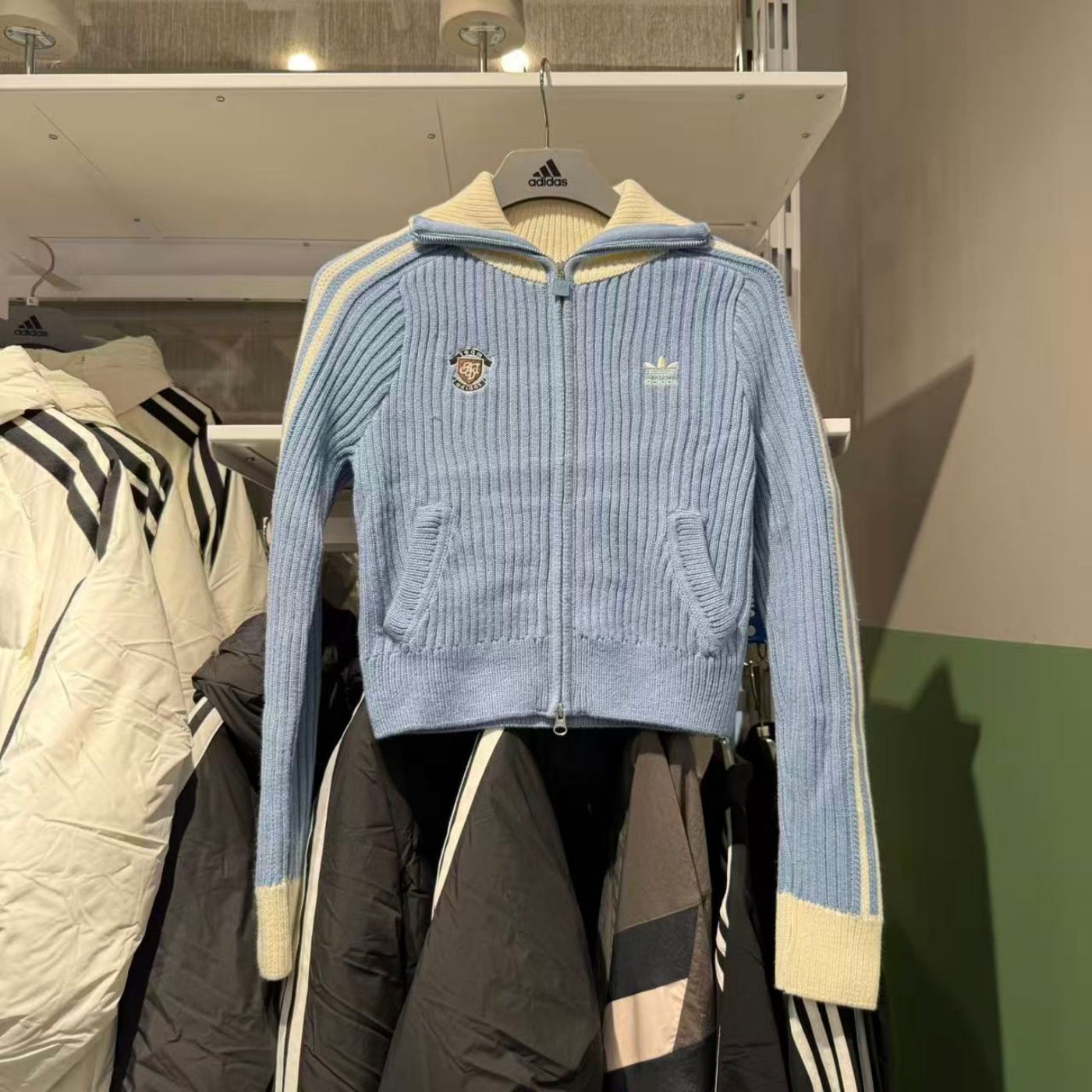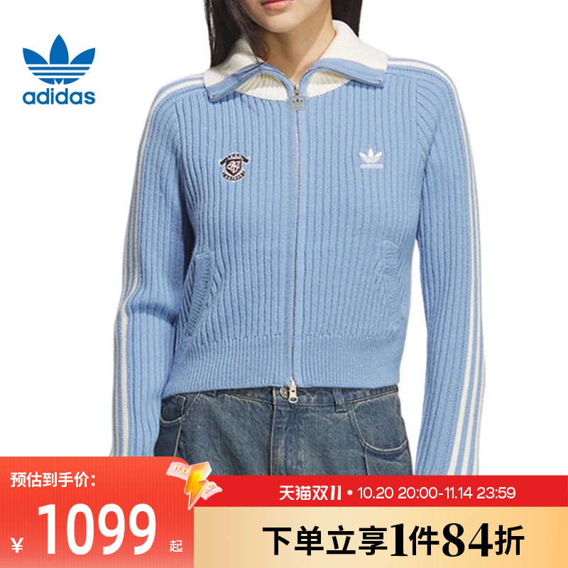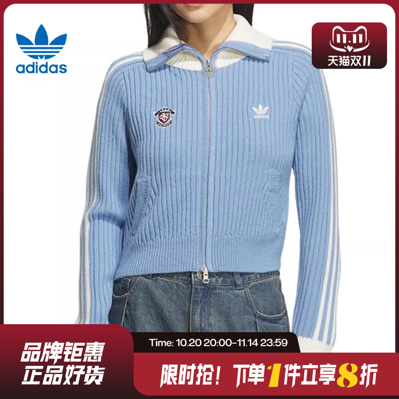 759阿迪达斯三叶草女装2025冬新品复古甜酷学院风蓝白针织外套KF0719