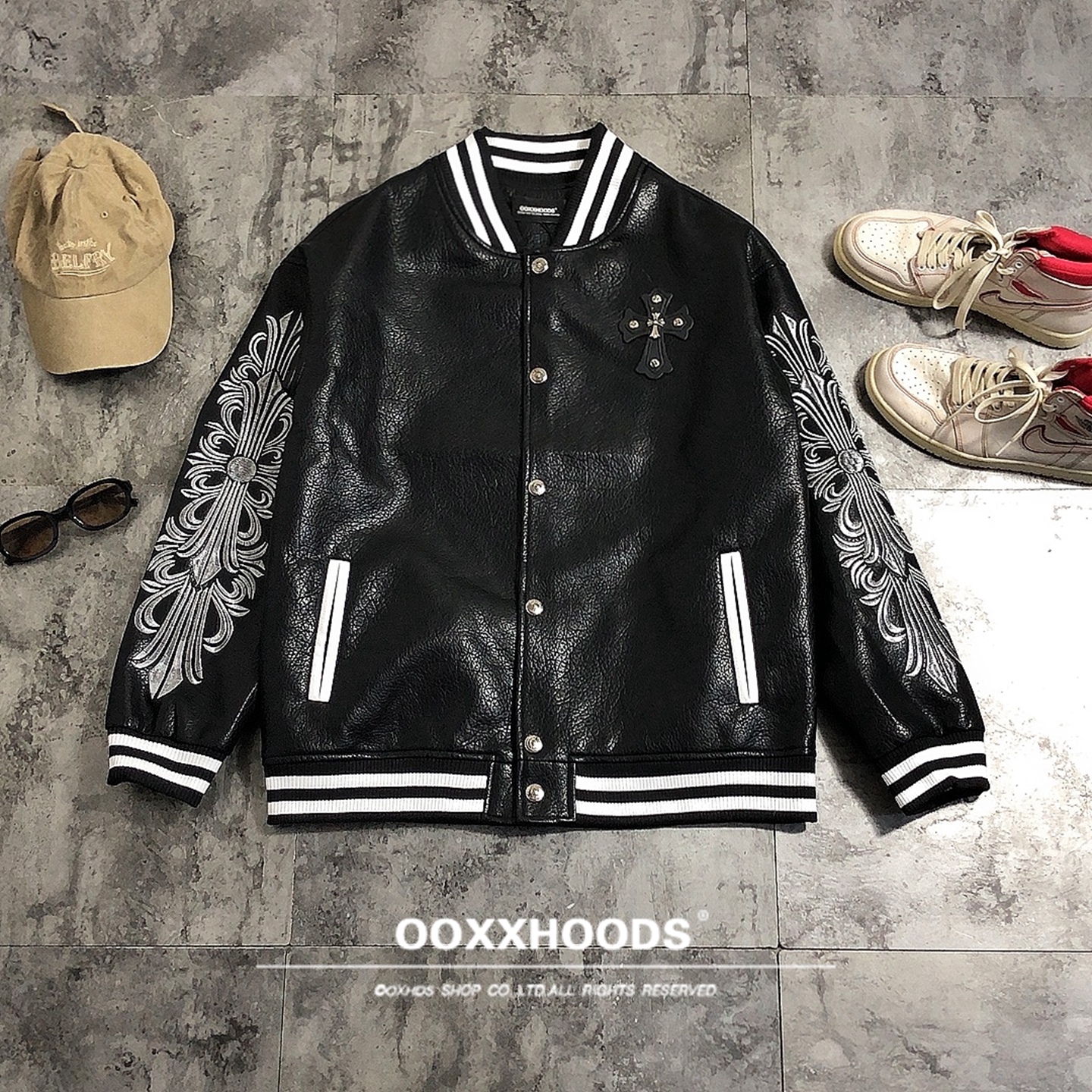 全pu皮质感刺绣花臂十字架夹克衫个性街头男女薄款棒球服潮牌外套